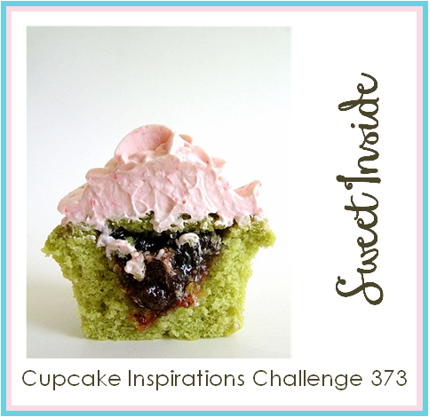 Ready for more decadent delights? Hope so! This week, we're inviting you to play along with Cupcake Inspirations Challenge #373~Sweet Inside. Look at that abundance of frosting goodness, set atop a jammy filling. These remind me of the cupcake tarts my grandma used to make: tart crust, a dollop of jam, cupcake batter, baked, then iced. Nothing like having your cake - and 'pie' - and eating it, too!